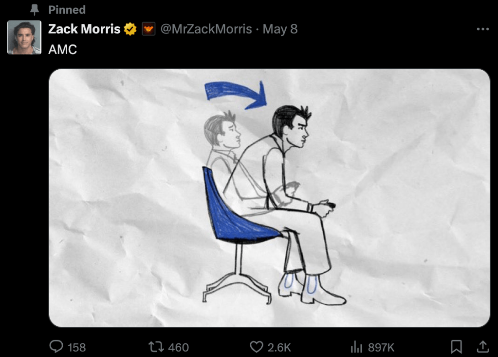 但细心的网友发现,早在5天前(5月8日),就有一个名为Zack Morris的推特投资大号发了同样一张图,并配上了AMC字样——当然座椅的颜色稍有不同: