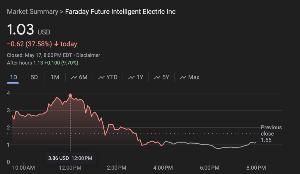 大家好,今天是2024年5月17日星期五。原本周末特辑是周六发布的,但是今天市场突变,有一个话题我们不得不说。大家应该也就猜到了:FFIE日内大崩。很多人都在问我:下周一还能“赌”吗?所以我就短更一期,话题就集中在FFIE。