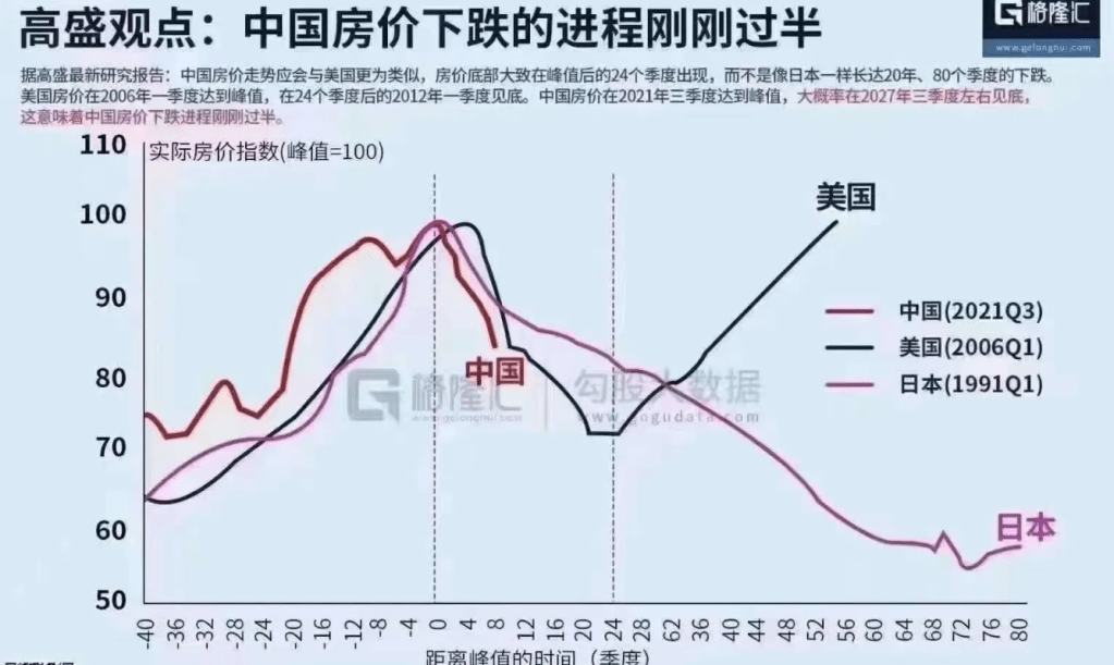 根据高盛分析,中国房价下跌的进程恐怕才刚刚过半。如果以美国经验做参考,中国的房价还有4年(16个季度),最大20%的跌幅可以走。