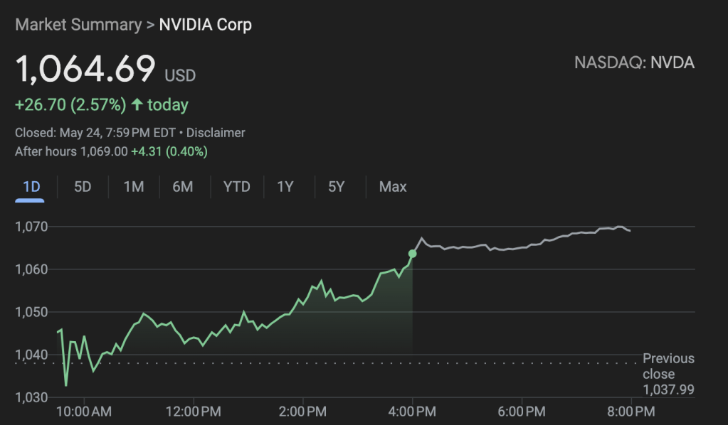 英伟达财报后一路上涨;财报后第一天,从950直接跳涨至最高点1060,后有所回落,盘中最低跌破1030;周五早盘,于1040附近震荡不到一小时后继续转涨。其中周五的走势出乎意料,因为大部分人都期待周四大盘闪崩之后悲观情绪蔓延,英伟达可能遭遇短暂抛售。