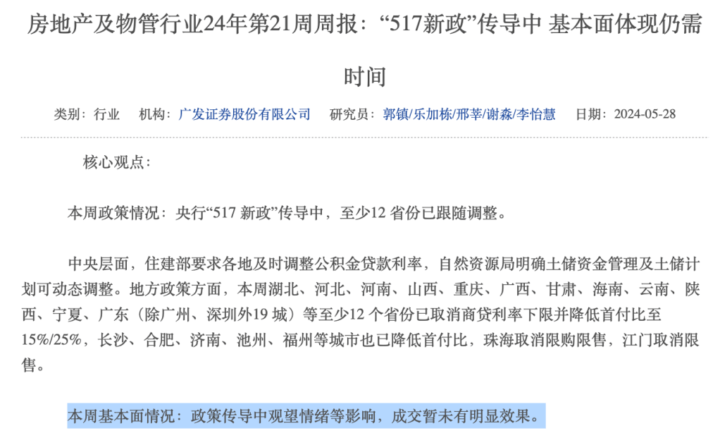 - 中国大陆两周前推出的5.17房地产新政收效甚微:广发证券的行业报告显示,上周,53城新房成交面积411 万方,环比下降8%,同比下降29%,新房成交热度下滑。二手房交易稳定,并未出现大幅上涨。同时,土地成交热度各类型城市均下滑。24年5月前23天,300城商住土地出让金同比下滑69%,截至5月23日,24年商住土地累计出让金同比下降30%。