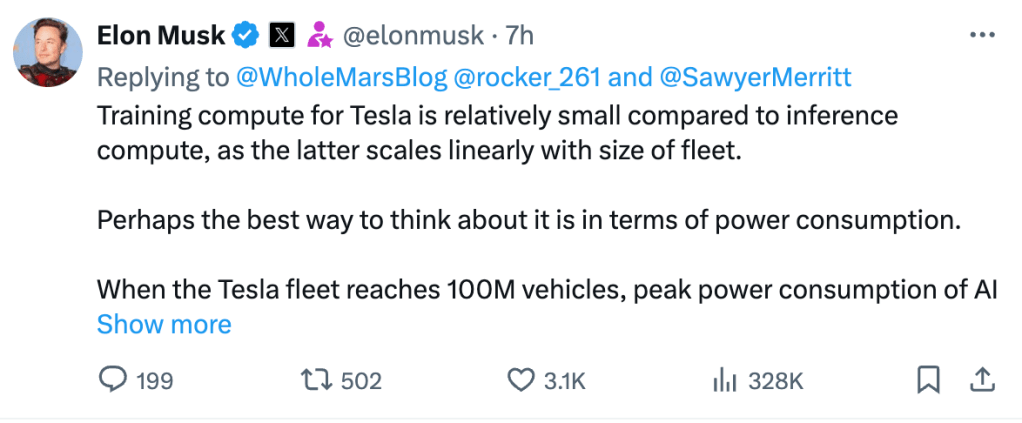 不过因为现阶段,特斯拉自动驾驶中对算力需求最大的部分其实在推理(Inference)而不是训练,毕竟FSD推理的任务量和运营车辆数目成线性关系,而训练并非如此。马斯克之前也抱怨过,随着模型不断进步,现在99.99%的训练数据对FSD都是无用的,因为他们并不包含那些最有价值的长尾信号——比如一次因为FSD失误而产生的车祸。