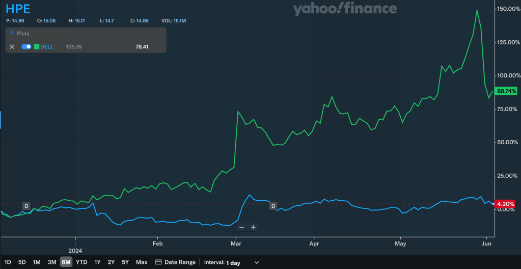 今天盘后,同样是靠向企业兜售服务器作为主要收入的惠与科技(HP Enterprise,2015年从惠普分拆上市)财报。财报显示,公司AI相关营收翻倍,云服务器业务也大幅增长18%;虽然收入同比增长不到3%,而且毛利率也从36.2%下跌至33.1%。但这并不影响盘后股价大涨超15%——和Dell暴跌20%形成了鲜明对比。