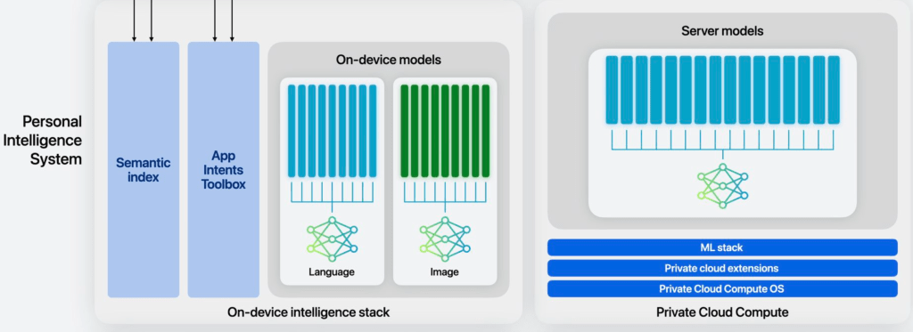 - 一套是运行在本地的,模型大小预计为30亿(3B)参数的一个small LM(SLM),这主要是服务于对延迟要求更高,但复杂度低的任务,如文本总结与改写;
