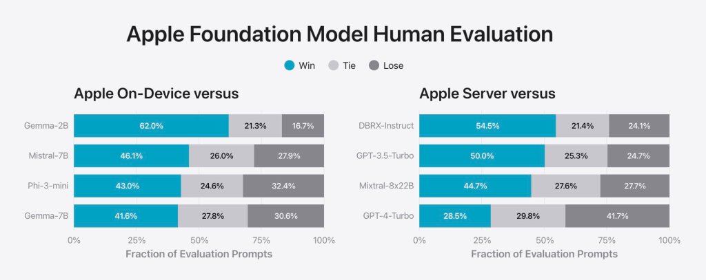 - 苹果本地的3B模型大部分情况下可以和Mistral的7B模型打个平手。而Mistral 7B已经是小模型中的佼佼者。但他可能依然比LLAMA 3的8B模型稍差一点。