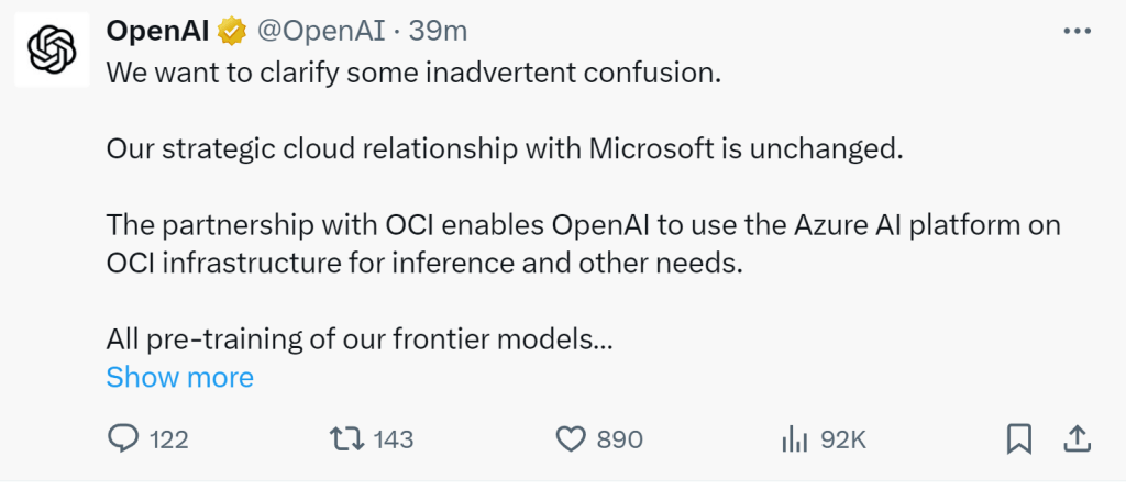 为了澄清市场对此消息的误会,OpenAI发表更新申明:说明他们与微软的战略云合作关系没有变化。与OCI的合作使OpenAI能够在OCI基础设施上使用Azure AI平台进行推理和其他需求。