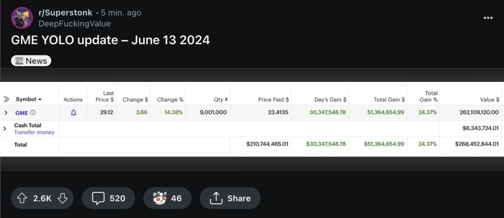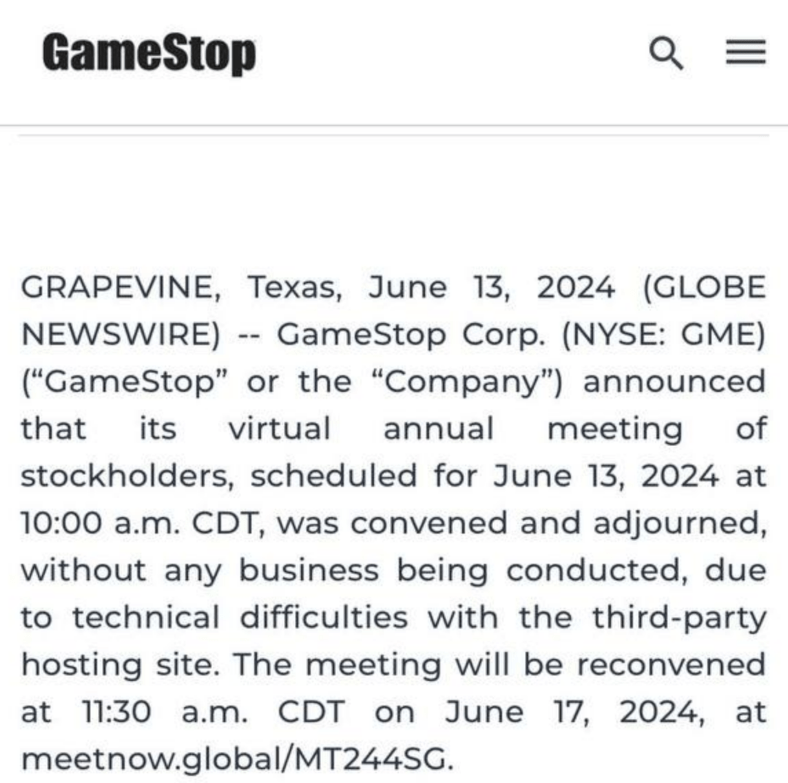 今天公司发布消息,表示因“技术原因”,将原定于今天(周四)召开的投资人大会推迟至2024年6月17日(下周一)上午召开。料想在会议上将会公布涉及董事会变动、公司运营方向或者新产品的重大消息,股价可能会有重大波动。持有GME投机的各位散户们需要保持关注。我们认为,如果真的有short squeeze,不是下周一就是这周五了。