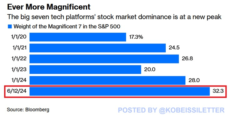 标普500指数和纳斯达克指数在今天再次创下历史新高,标志着这两个指数连续第四天创纪录收盘。标普500指数上涨了0.23%,而纳斯达克100指数则上涨了0.57%。尽管这两个指数均有所上涨,但市场的广度明显疲弱,两个指数中都有大量股票收盘时表现不佳。标普500指数中“Mag7巨头”的占比达到32%的新高,突显出少数大盘科技股在市场表现中的主导地位。