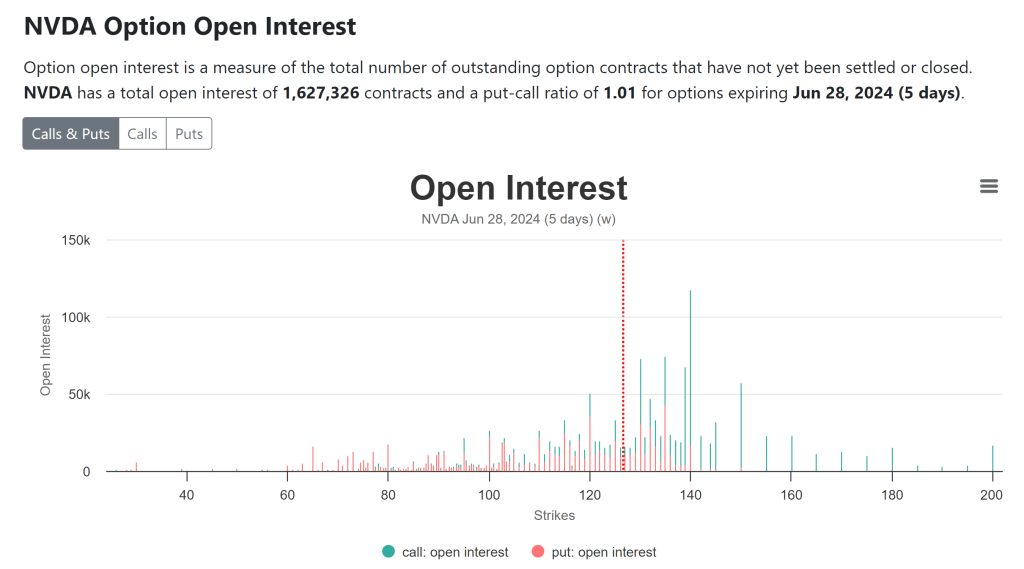 从下周到期的NVDA期权分布来看,看多期权也主要集中在140下方;而做空期权在120有一个峰值。