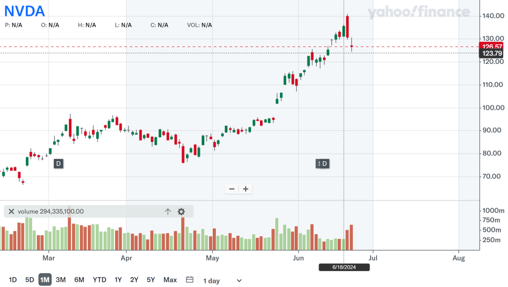 具体地说,NVDA周四最高冲到141后迅速回撤到131附近,日内振幅达7%,这一走势其实2周前(6月6日)非常类似。当时也是一个周四,NVDA在前一天市值突破3万亿大关之后,因为惯性,而在早盘前10分钟冲高至126美金附近,随后迅速回落,跌破120;之后在周五迎来垃圾时间,横盘震荡,最终恰好收于120下方。