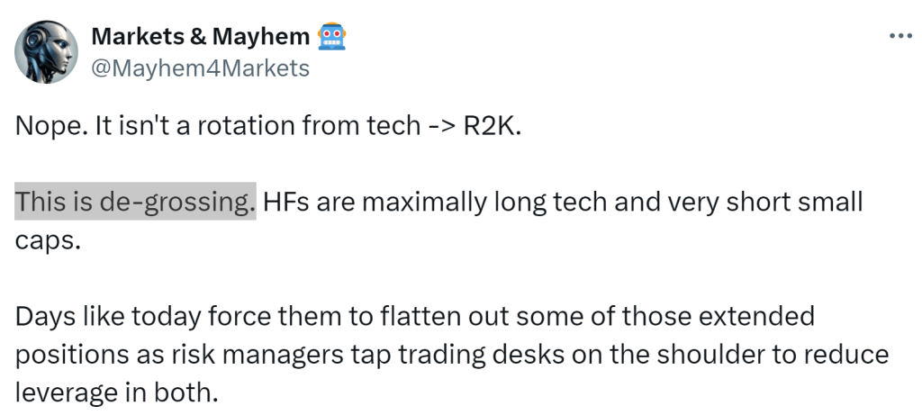 市场有分析师认为,今天大科技的“急速回撤”并非是机构将资金“换仓”至小盘股的开始,而更多其实是一种去杠杆化(de-grossing,减少总头寸)。机构在大科技的仓位过多,而又拥有很多小盘股的做空头寸。今天的CPI强迫他们在两头平仓,减少方向性的风险。