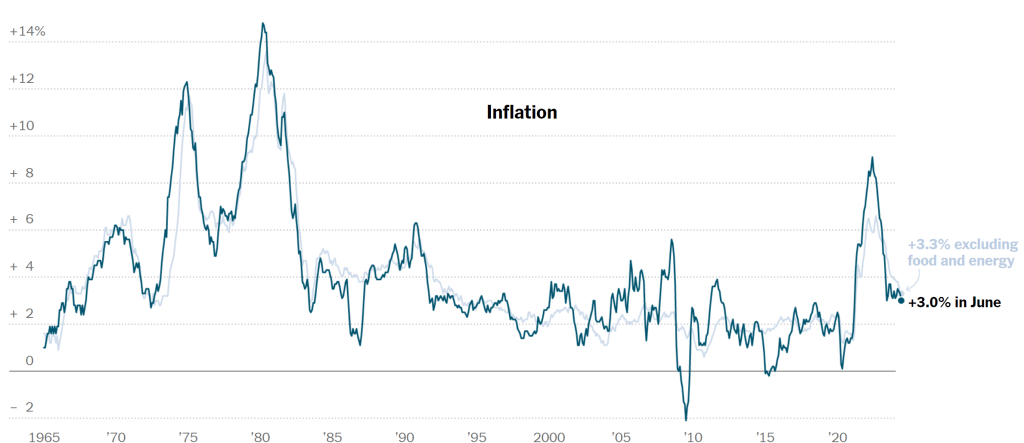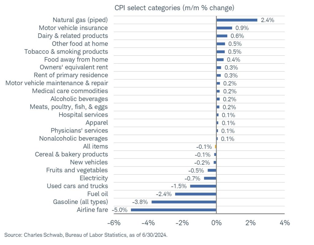 盘前一小时,美国公布CPI数据。数据显示,6月份美国CPI数据不增反降,环比下跌0.1%,预期为增长0.1%,市场惊喜为两个百分点。作为结果,年华CPI同比增长也降至3.0%,低于预期的3.1%,大大低于五月份的前值3.3%。