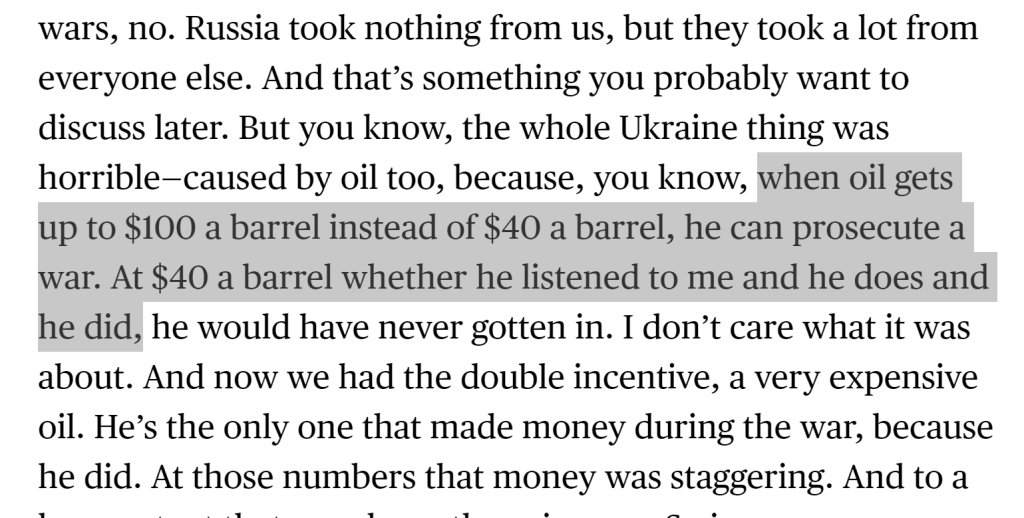 - 如果油价能维持在40美元一桶,普金会听话,那么也就不会发生俄乌战争。高企的油价实际上帮普金助长了自己的领土野心和军事计划。