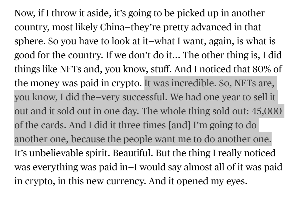 - 另外一个原因是,不想让中国在加密货币领域取得领先地位。但根据我们对中国政府的理解,交易加密货币在中国是违法行为。因此这个所谓的“领先地位”或许并不存在
