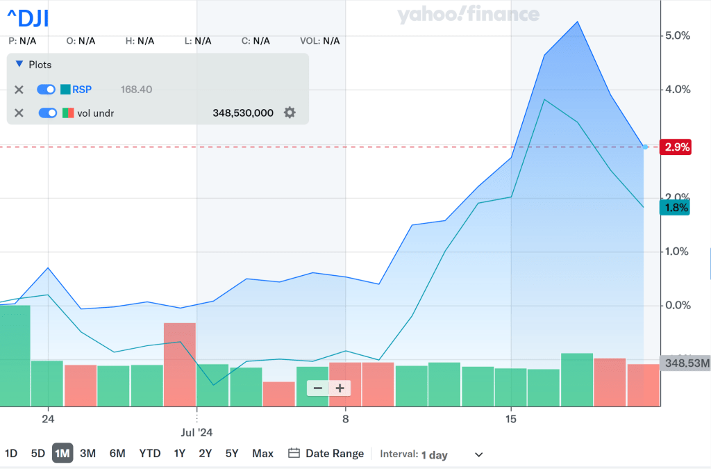 但更为神奇的是,周五,即便是受“市场广度”利好的Dow道琼斯指数和平权SPY500 ETF RSP均出现下跌。这表明,周五的大跌,似乎并非“市场轮动”可以解释,而更像是一次广泛的抛售。