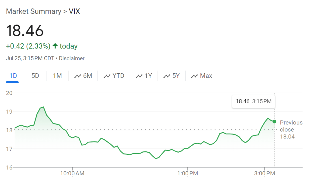 今天,美股风起云涌;受昨天GOOG/TSLA财报后市场抛售动能影响,pre-market刚开始各大板块就先跌为敬,代表市场波动率预期的VIX一度冲到19上方。开盘后,指数又像吃了泻药,急速下探。