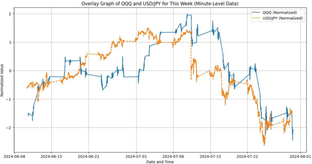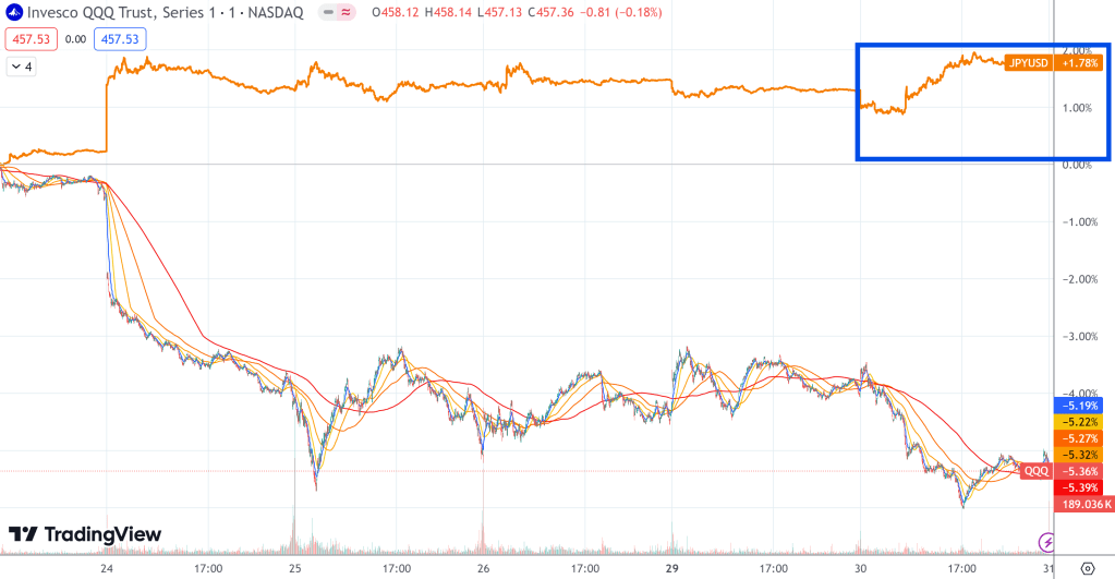 - 注意到,QQQ的下跌和JYP/USD的大涨几乎是完美对应,不带一分钟的延迟;而当时市场对科技股抛售给出的解释,还停留在GOOG/TSLA财报不及预期,华尔街对AI投入失望等因素上。事实证明,这些因素并非根本原因。