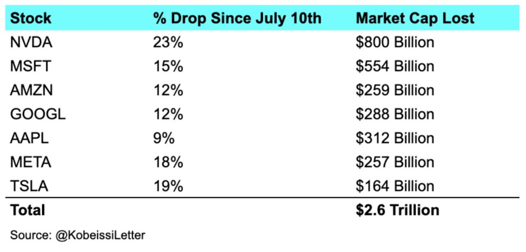 7月10日以来,在美国CPI数据的刺激下,日元汇率触底反弹;7月十日至今,Mag7 累计蒸发达2.6万亿美金。QQQ回调10%,NVDA跌近25%,加了杠杠的做多ETF更是惨不忍睹:三倍做多Mag 7 ETF FNGU -34%,三倍做多费城半导体ETF SOXL -46%,甚至仅仅是两倍做多NVDA的NVDL,都也已经事实上腰斩。