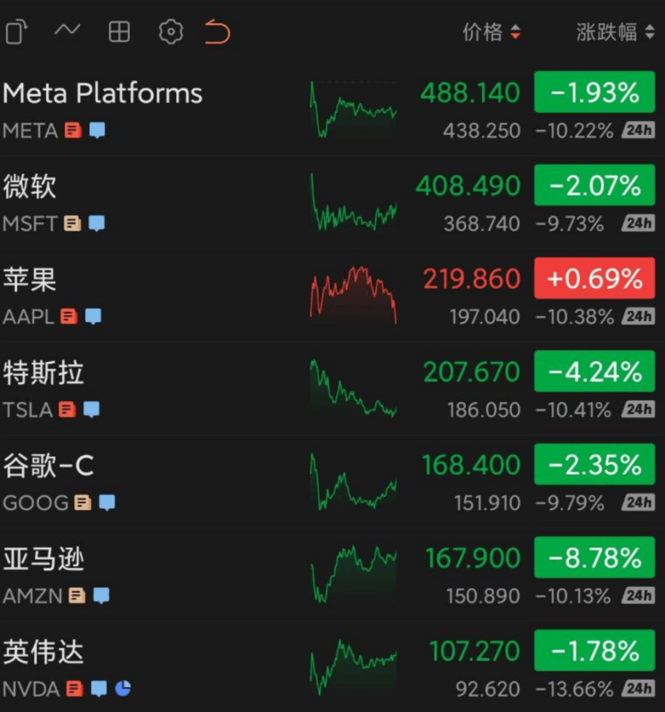以今天盘前来说,纳斯达克期货大跌4%;NVDA跌11%,100美金的支撑位看都不看直接跌破95;其他几个Mag 7成员更是联手上演了一出好戏(注意24hr夜盘示数):