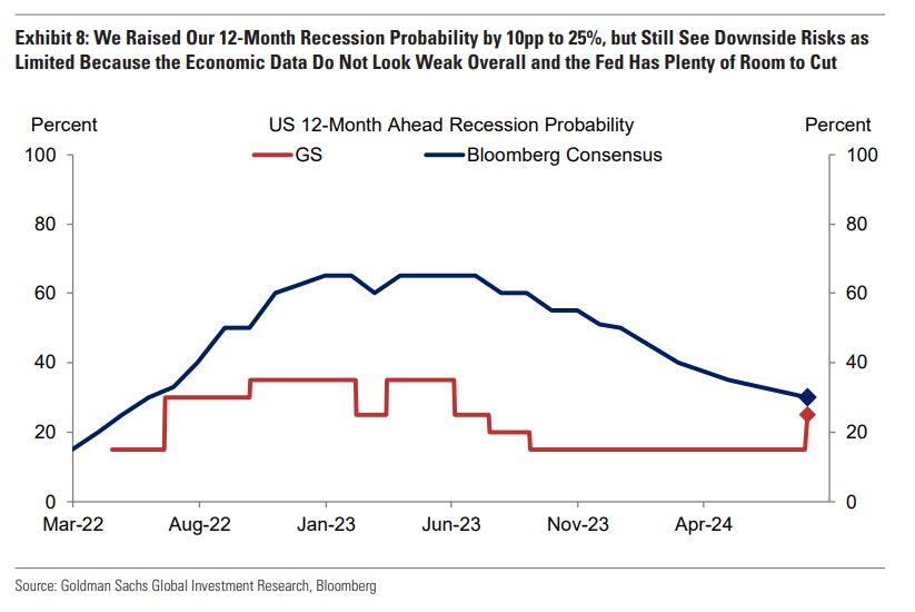 同一时刻,考虑到周五失业率的情况,高盛已将美国12个月内的衰退概率从15%提高至25%。