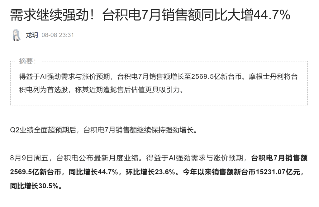 今晚,台积电也公布了自己的7月份业绩。数据显示,得益于AI芯片的强劲需求,台积电7月营收年增44.7%,月增23.6%至2569亿元(约80亿美元),再创历史新高。今年以来累计营收年增30%。受此利好消息影响,盘前TSM涨超3%,接近7/11历史新高。