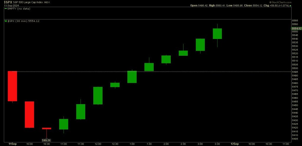 早上的抛售持续到7:40为止,然后NVDA为首的个股开始拉涨。最终,NVDA全天涨8%,突破115中继位,收116;QQQ更是夸张,收复全天近2%的跌幅,反转并收涨2%,全天振幅4%。SPY连收10根30分钟大阳线,堪称8/5以来第二个“大奇迹日”。