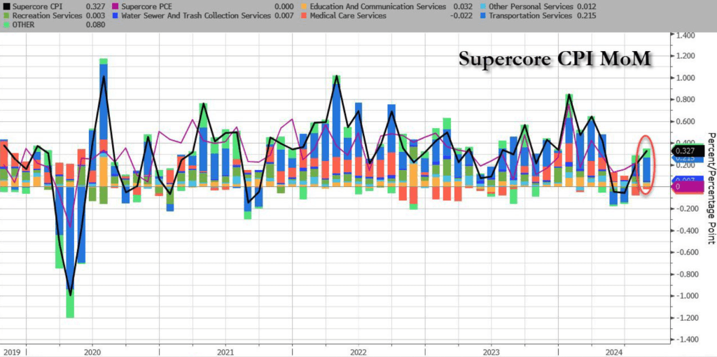 仔细观察,主要增幅来自服务大类的交通服务项(Transportation Service),其中包含机票、汽车保险等。与此同时,房租通胀也出现了抬头——随着降息临近,房屋贷款已提前下跌,这会促进房价上升并最终传导至房租上。