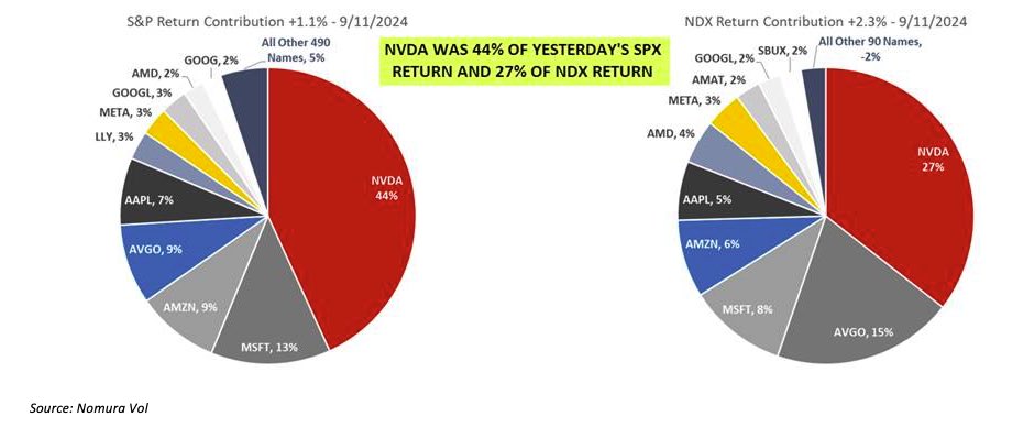周五的反弹还是显示出了一定的阻力。其中英伟达最为明显,受Gex 120 Call Wall影响,NVDA精确收在120下方,日内最高触及119.99。这使得所有本周冲NVDA 周五120的看涨期权都归零了,俗称“杀期权”。一份群内分享的研报显示,NVDA贡献了SPY周五近44%的涨幅;NVDA和AVGO则联合贡献了纳斯达克涨幅的42%。可见,NVDA确实是大盘上涨的催化剂。