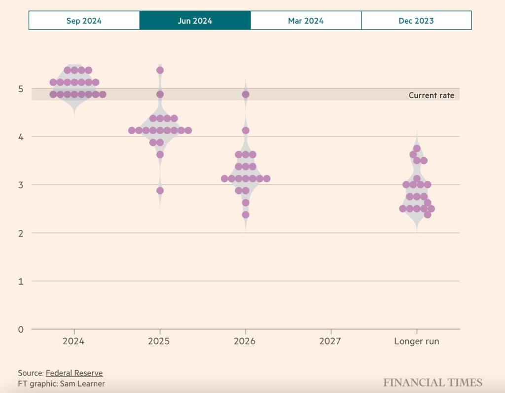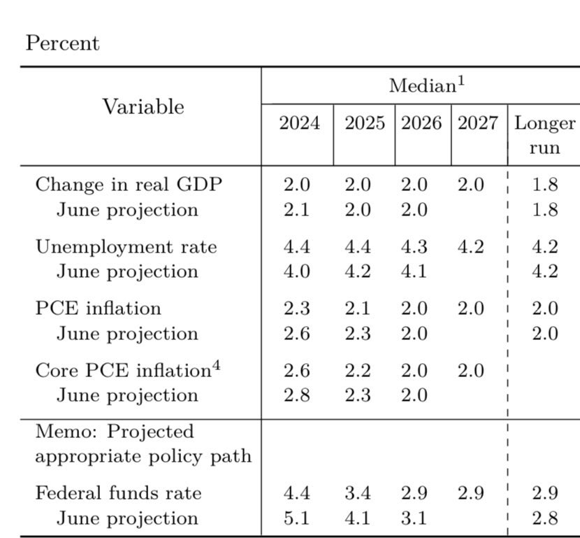 - 通胀迅速降温。6月份认为24年底的核心PCE通胀会维持在2.8%,现在认为只会有2.6%,下降20个基点;Headline PCE也从2.6%降到了2.3%;