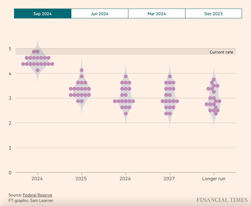 从点阵图看,和6月相比,9月份的点阵图明显下移(这意味着更大幅度的降息)。但长期来看,中性利率不变。