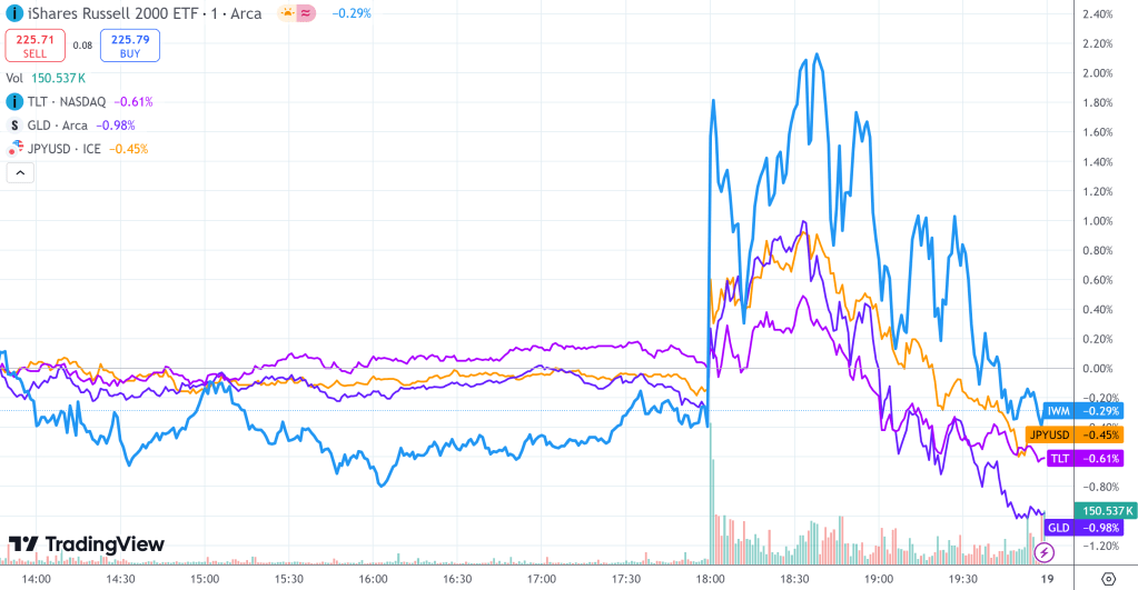 不仅美股大盘,包括罗素2000,日元、黄金和国债在内的降息受益板块均呈现出先涨后跌的姿态,抹去日内全部涨幅。NVDA也由涨转跌,最深一度跌破113,令人失望。但我认为依然仅仅是交易机器人多空双杀的结果。具体走势还是要看明天开盘。现在看来,盘前已有不少反弹并涨回了周三跌幅。