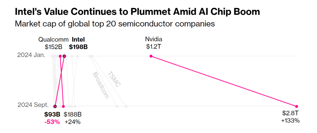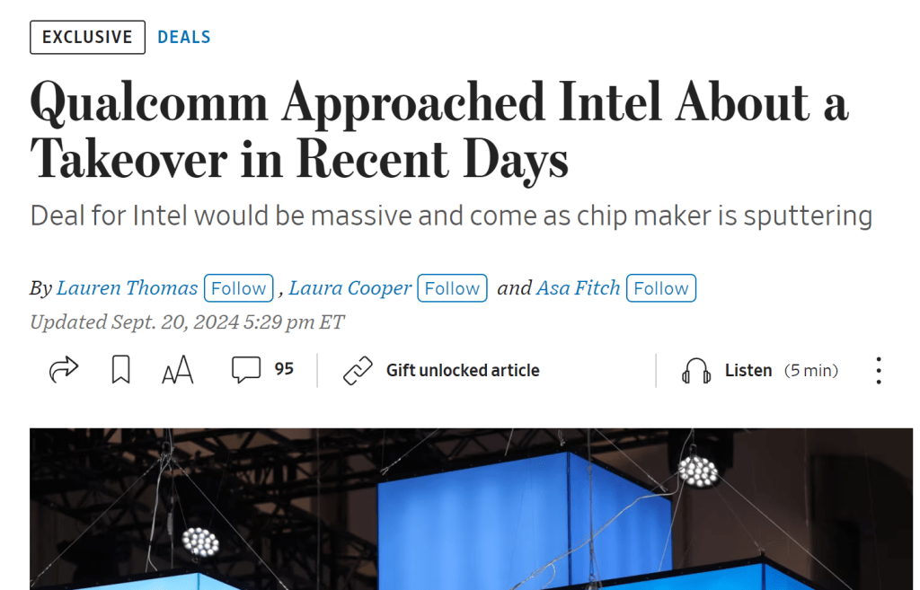 - 自24年年初以来,芯片一哥INTC连续遭遇重大挫折。首先是晶圆厂投资耗费数百亿但进展寥寥,不断延期,让公司入不敷出;先进制程工艺方面又落后台积电;AI浪潮在在NVDA的暴击下无人问津,几乎没有分到一杯羹。自家主打的新一代消费级桌面CPU最近还曝出缩缸事故,令消费者望而却步。一个无法忽视的大环境是,X86的市场份额正在被ARM不断蚕食。在诸多负面消息的连续打击下,英特尔股价从年初最高的$50一路跌破$20,跌回2001年的水平。堪称一夜回到解放前。公司估值甚至已经低于高通,这可能是触发QCOM收购念想的一个动因。