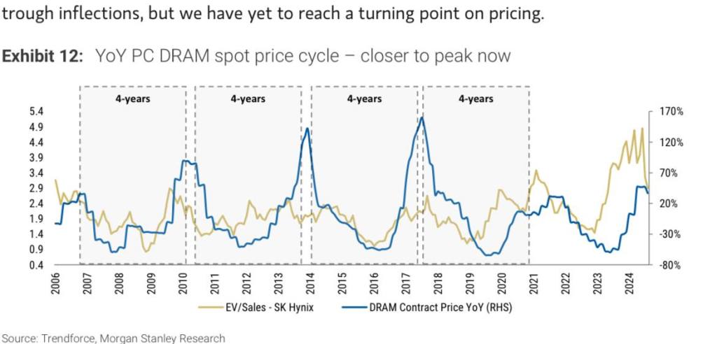 根据摩根斯坦利的研报,2022年以来的这一轮DRAM周期可能已经见顶。但这张图其实也有很多问题,比如2022年顶部非常低,仅达2007年水平,这显然和加息周期有关。此外,从2022年算起,2024年的所谓“顶部”只经过不超过2年,尚未发育完全就开始腰斩,这似乎和过去4年一次的周期不同。