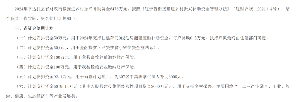 但有一点是相同的:绝大部分举债将用于帮助地方政府解决城投债(也即地方债务)。通过观察一份东北某县“乡村建设补助”文档我们不难发现,总计补助6476万元,其中6019万元用于入股城投集团及相关项目,占比高达92%。用于高职学生的直接现金补助占比仅不到1.5%。