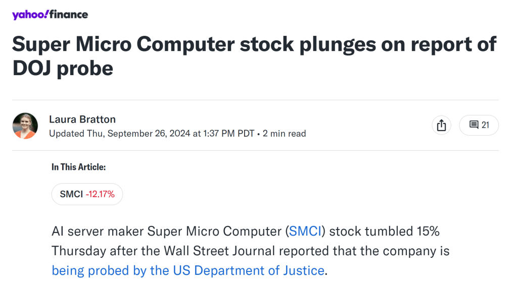 结果早上7点半,NVDA闪崩。我还以为是出了什么关于B200的坏消息;结果一问,原来是SMCI被美国司法部调查了。原因也非常搞笑:其实就是我们之前提醒过的,SMCI 10K表的问题。