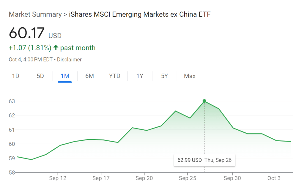 如我们之前所说,港股的这轮暴涨是海外基金亚洲部门调仓所致,而且很可能是一种Gamma Squeeze,也就是大量买入看涨期权逼迫股价上涨的机制。由上图可知,除中国以外的新兴市场ETF(EMXC)在9/26日后逆联储降息宽松势头反而一路大跌,资金流出显著。