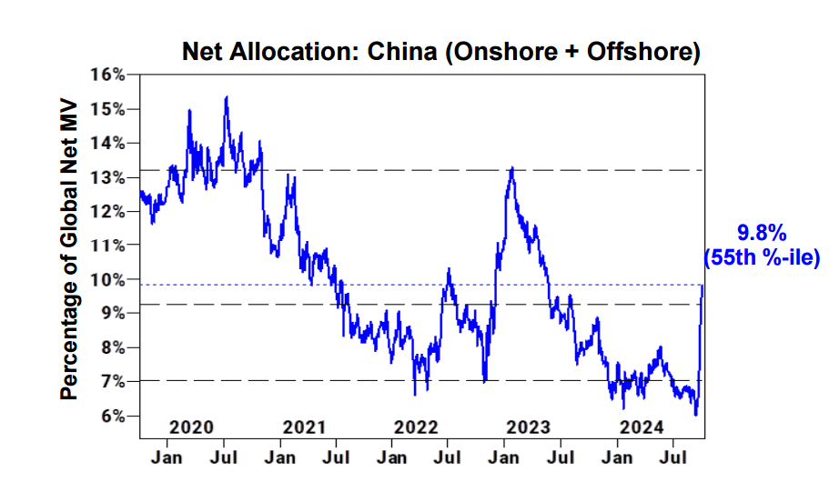 短短2个星期,亚洲资金在中国配置的比例已从不足平均值的7%跃升至9.8%,接近10%;作为对照,疫情放开时该比例一度最高达13%:这预示着反弹可能还能持续一段时间。外资的犹豫既是坏消息,也是好消息。如果政策失败,本轮牛市就到此结束;而如果经济好转,外资无疑将推动股市继续走高。高盛预计,中国股指未来还有15-18%的上涨空间。