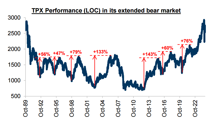 左图总结了自21年熊市以来中国指数出现的每一次反弹及其幅度。在基本面未能好转的前提下,反弹都难以持续,只能当做投机对待——即使日本也不例外。右图是日本指数自89年以来,每次大反弹后的表现。可以看到,甚至在13年的安倍经济学后,日股每次反弹都伴随着相当惊人的回撤,直到2018年才正式走出箱体,突破阻力位。虽然本次刺激转向力度空前,但股价长期向好必然需要经济支撑,否则就只是投机游戏。