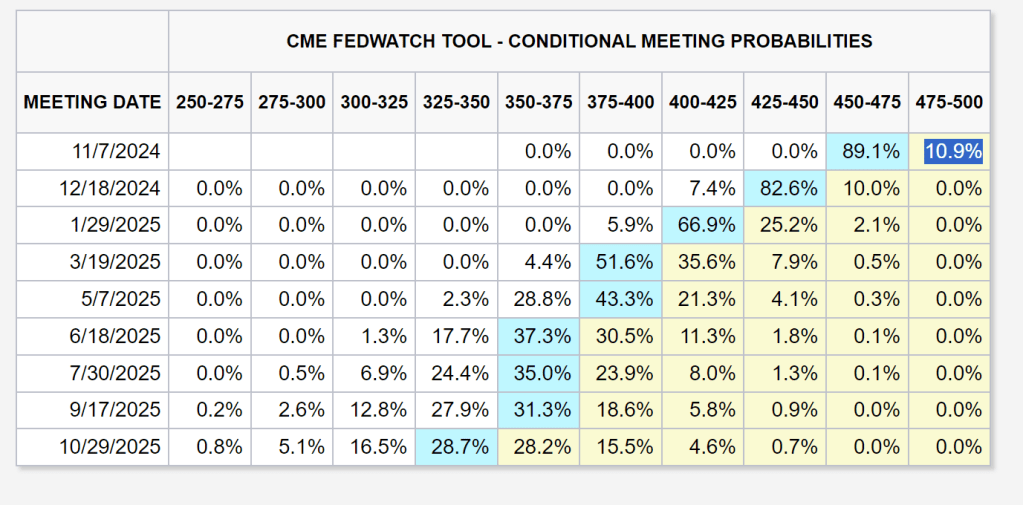 上周五,美股大非农数据远超预期。其中失业率仅为4.1%,低于预期的4.2%;新增岗位更是飙升至25.4万,大超预期的15万,7、8月新增岗位也上修了数万。数据出炉后市场哗然。它对于稳固软着陆,增强美国经济信心固然有好处;但对于年内降息而言则是泼了一盆天大的冷水。数据一出,11月降息50bps的概率降至不及10%。高盛将美国衰退概率从20%下调至15%。