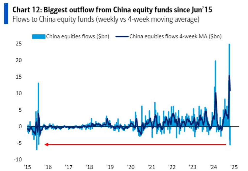 截至10月23日当周,中国ETF上周流出64亿美元,为连续两周流出。高盛研报显示,9月底以来外资买入中国的股票已经被抛售了80%。10月份,对冲基金在中国市场上的总仓位大幅下降。这也反映出市场对“刺激政策”的失望。