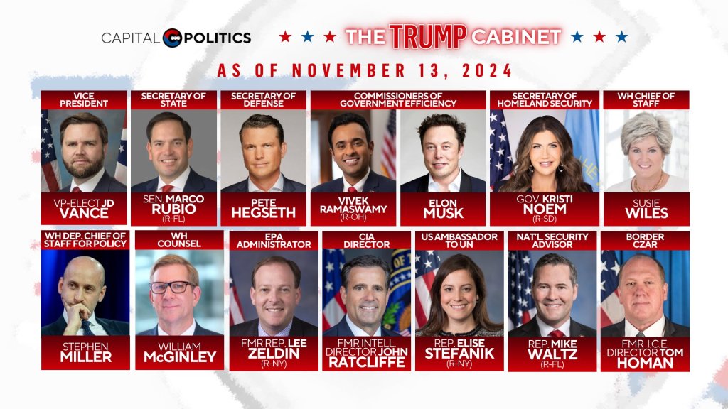 - 对华强硬的卢比奥任国务卿,对移民强硬的Tom Homan任边境沙皇,马斯克与Vivek将联合领导政府效率部门DOGE,以及前民主党人士小罗伯特肯尼迪将负责公共健康事务等等。