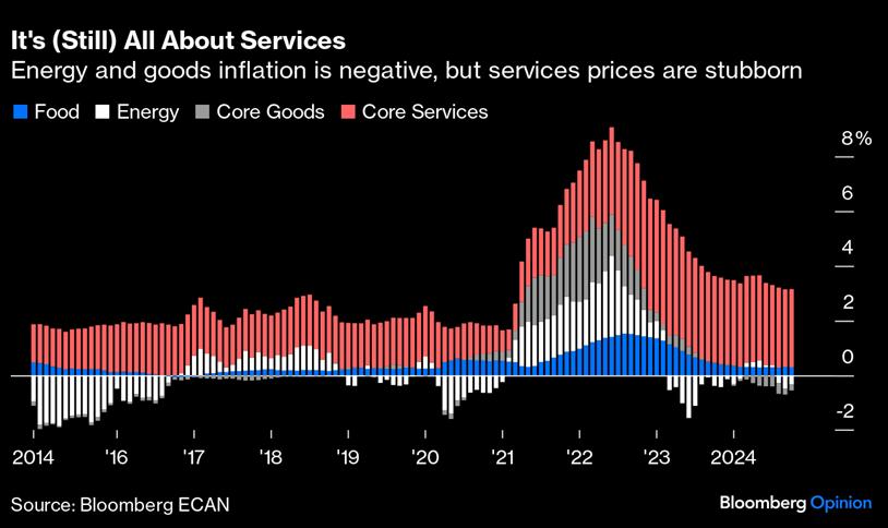 周三,美国盘前CPI。核心CPI环比增幅预期为0.3%,实际增速0.3%,前值也是0.3%。这表明,通胀并未取得进展,但也没有大幅恶化。通胀的顽固和粘滞期可能比市场想象的要更久。仔细观察细分项,通胀的贡献主要来自服务而非商品。由此大概可以估计,特朗普积极的“关税壁垒”政策对CPI影响可能不会太大。核心商品(Core Goods)和能源(Energy)实际处在通缩阶段。住房、医疗和工资占通胀贡献的大头。