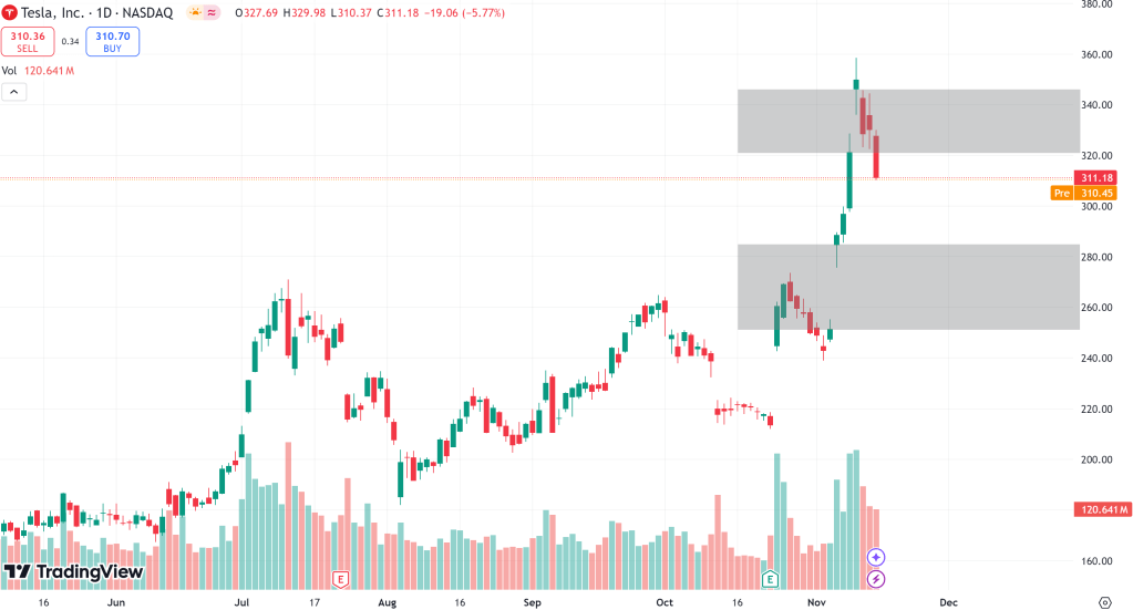 如果TSLA跌破300,那基本意味着它回吐了特朗普胜选后这一波情绪交易的全部涨幅。