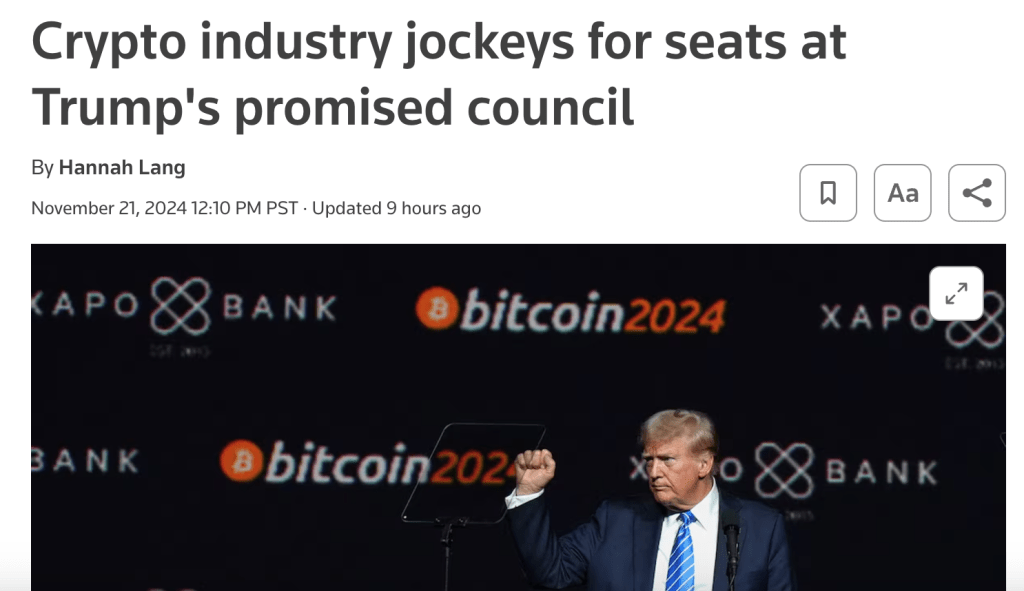 只要pro-crypto的特朗普上台,不管是谁当财政部长,都是市场进一步炒作的接口。这不,今天路透社就传闻,特朗普要成立新的加密顾问委员会(