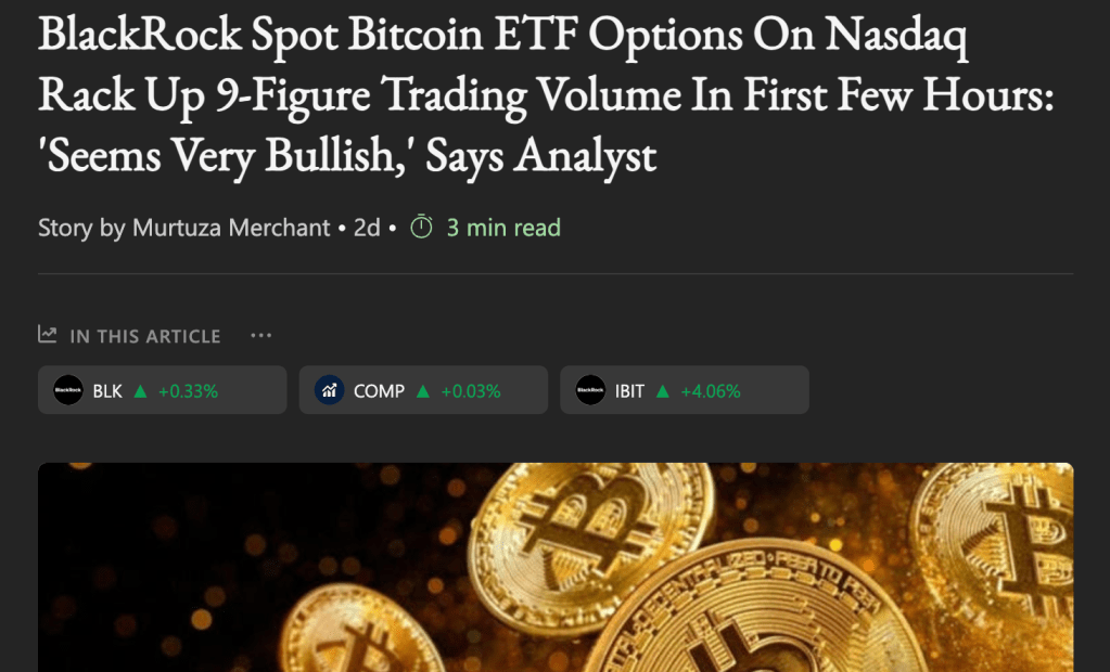 周二,布莱德(BlackRock)旗下比特币ETF IBIT在美国纳斯达克交易所开通了全球首个比特币ETF期权产品。牛散、炒作资金疯狂涌入,第一天就实现9位数的成交量。理论上说,你可以把价外期权理解为一种自带100倍杠杆的工具,疯狂买入的Call Option迫使做市商买入Unerlying Asset对冲风险,在这个例子中,这个Asset就是比特币。