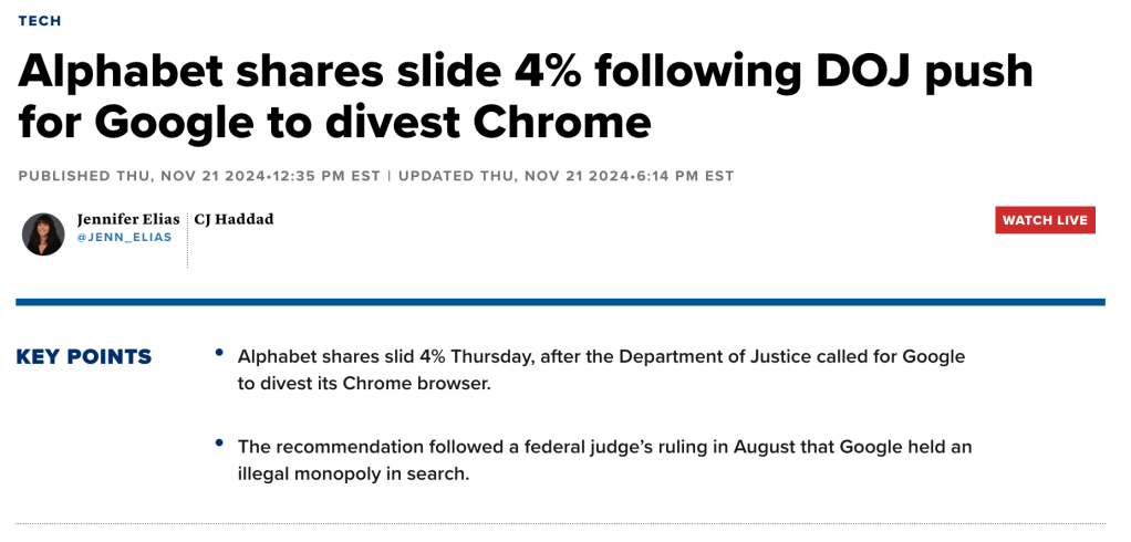 周四,谷歌股价意外大跌4%,是Mag 7板块中跌幅最大的科技公司。这可能和近期DOJ决定将Chrome拆分出谷歌,以及OpenAI决心在搜索领域和Google竞争有关。
