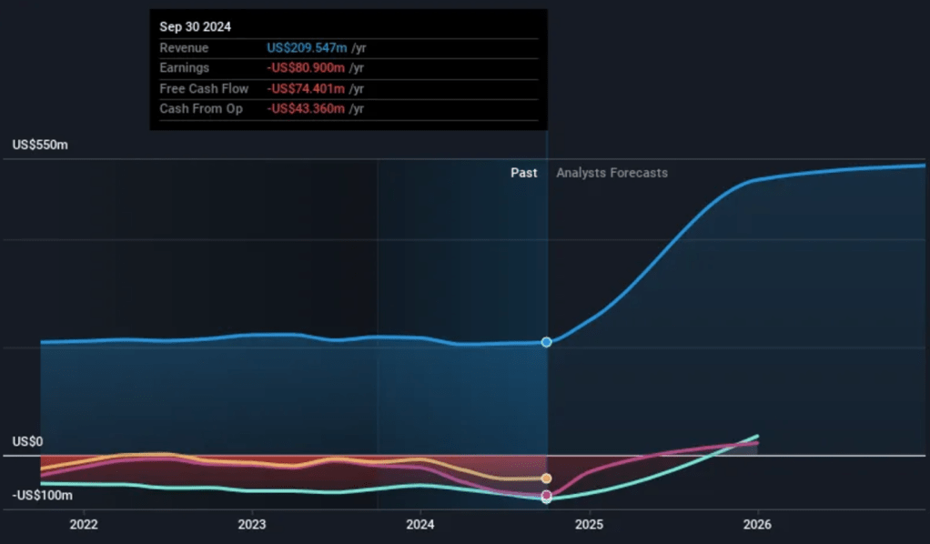 第三季度财报显示,AAOI总营收为6500万美金,较上一季度略微上涨3.8%。但EPS为负42美分一股,意味着公司运营实际上出现亏损,且亏损比预期要高35%。即便如此,财报后股价上涨,盖因市场预期25年,公司的运营情况会出现显著改善:
