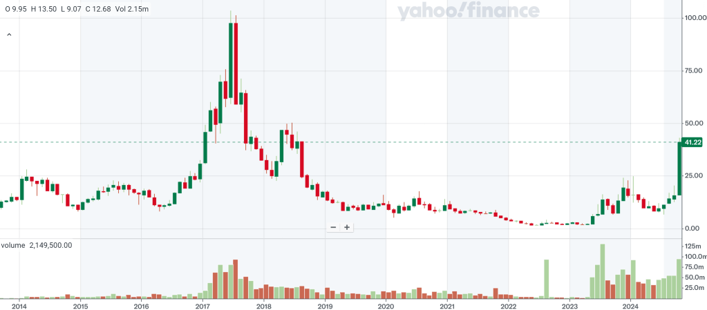 AAOI是一家做光纤的公司,全名叫AOI。从他的业务范围可以看出,这家公司存在有一定年头,早在2013年就于纳斯达克上市。该股可谓是一只大名远扬的妖股,2017年6月最高一度涨至$104。一个月后,随着一根放量大阴柱股价一路暴跌,最低跌至2023年4月的1块左右。6年跌幅达到了名副其实的99%。