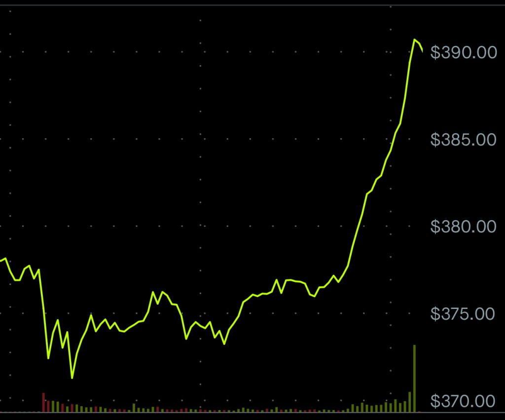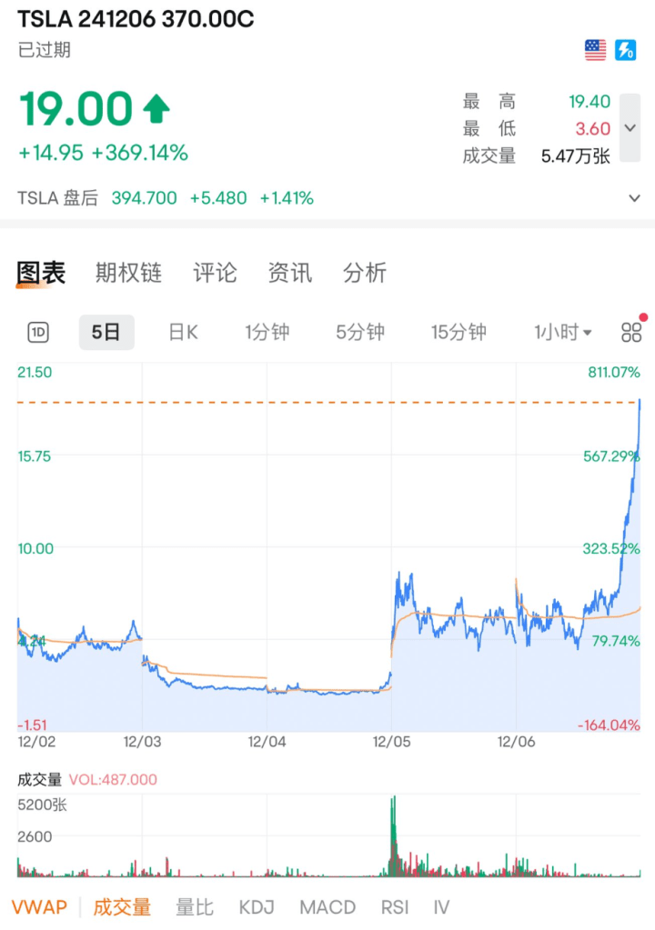 - 又是Gamma Squeeze:这一笔期权在周五最后半小时,因Delta增速远超Theta衰减,迫使Market Maker(做市商)不得不买入正股对冲;但随着正股的买入,又适逢成交量较小的12月准假期,股价被迅速拉升;随着股价的拉升,原本已经归零的$380,甚至$385期权也进入价内,迫使做市商继续买入正股对冲。最终的结果,也就是我们所看到的,最后半小时内TSLA雪崩式、踩踏式的暴涨。30分钟内从375涨至395,涨幅达20美金,约5%。