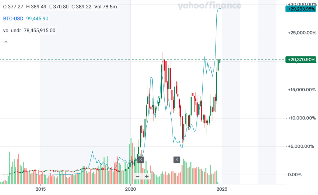 - BTC和TSLA有极强的关联性。当2022年美联储激进加息时候,TSLA和BTC的牛市都同时停止了。但2024年美联储开始降息时,BTC和TSLA又都一起突破了前高。很显然,这背后反映出的逻辑是美联储的利率政策。TSLA因给员工发RSU股权稀释等因素,股价并未破前高,但市值1.25万亿已经破了前高。